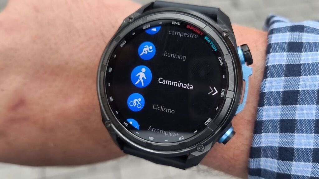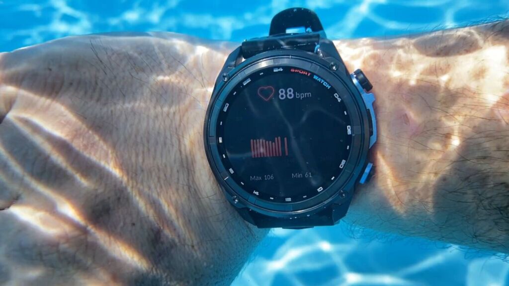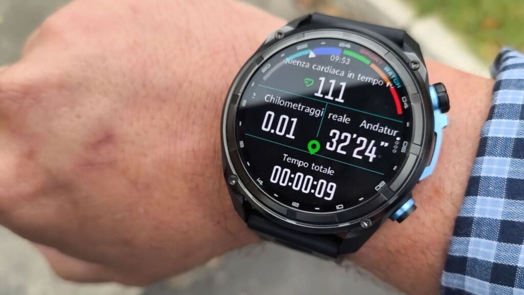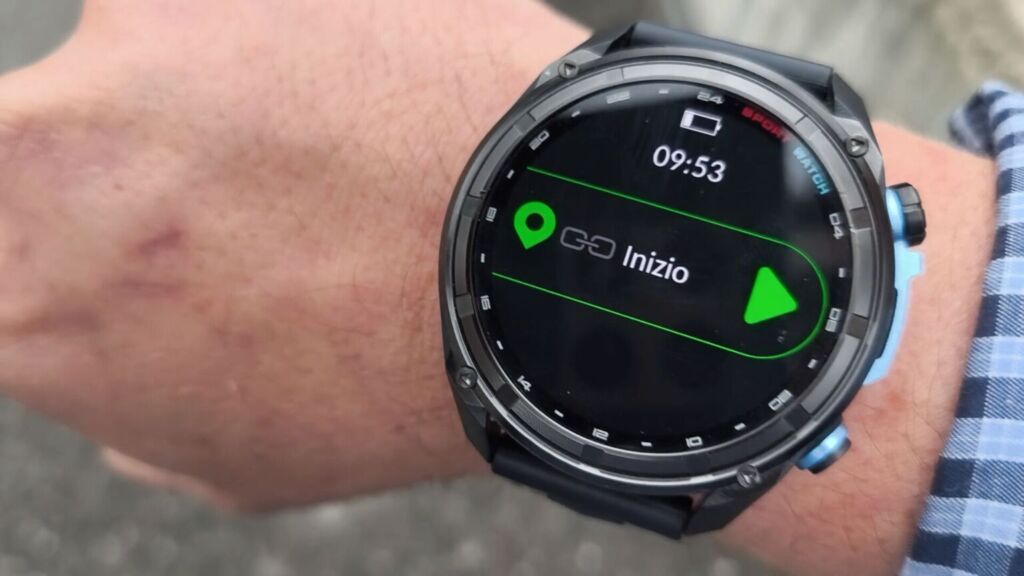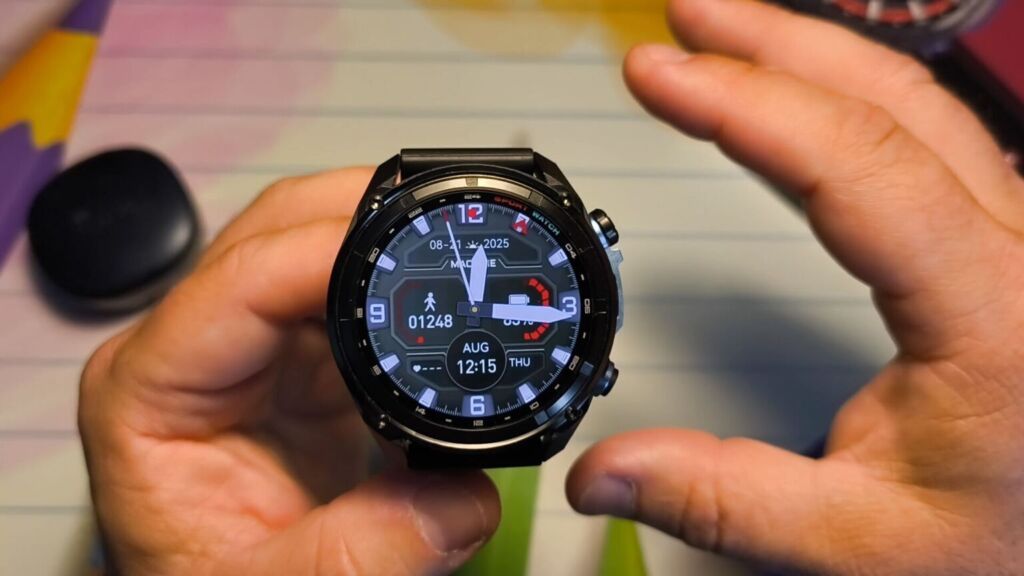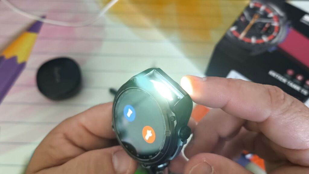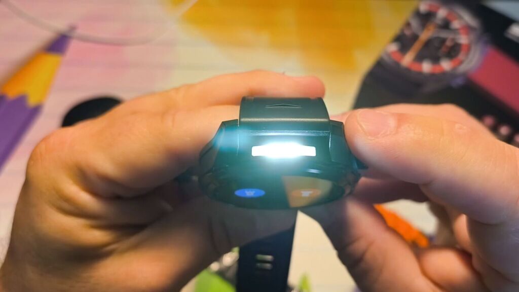 Die Smartwatch KKTick Tank T5 überzeugt durch ihre robuste Bauweise, die, wie der Name schon sagt, ein wichtiges Verkaufsargument für diese Uhr ist. Vom ersten Moment an spürt man, dass sie wie ein Gerät für Outdoor-Abenteuer konzipiert ist. Das Gehäuse ist außergewöhnlich robust, und das kratzfeste Display sorgte bei meinen Tests für ein gutes Gefühl, da es Stößen und Kratzern standhielt, die normalerweise weniger robusten Uhren widerfahren. Das Design ist unverhohlen funktional. Die robuste, fast industrielle Ästhetik signalisiert deutlich ihre Outdoor-Qualitäten. Während die Größe für Personen mit schmaleren Handgelenken ein Problem darstellen kann, fand ich die Uhr bei Aktivitäten relativ angenehm zu tragen. Oh, und habe ich erwähnt, dass die Uhr eine spezielle Taschenlampe hat? Sie beleuchtet nicht nur das Display in hellem Weiß, sondern oben befindet sich auch eine echte LED, die einen starken Lichtstrahl abgibt.