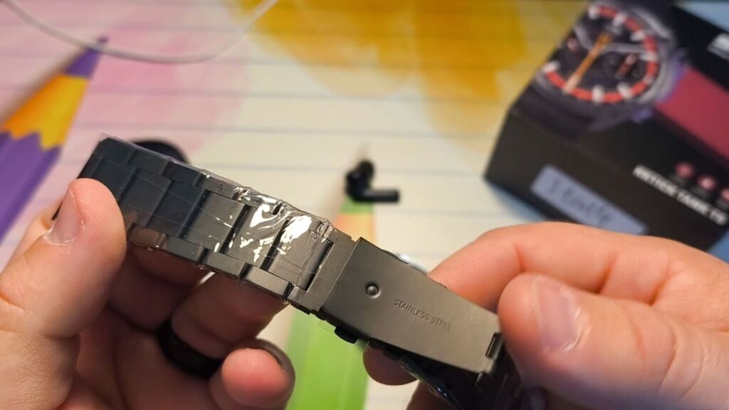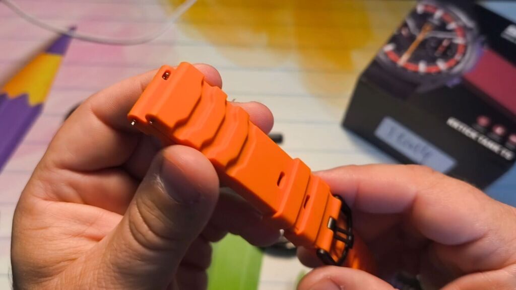 Da die Tank5 über ein 24-mm-Schnellverschlussband verfügt, lässt sich die Uhr ganz einfach individuell gestalten und für mehr Stil und Komfort sorgen. Im Lieferumfang sind drei Bänder enthalten – eines in Orange, eines in Schwarz und eines aus Metall –, sodass sich Outfits von sportlich bis elegant zusammenstellen lassen. Die Verarbeitung ist gut, allerdings gibt es Verbesserungsbedarf; ich habe keine Probleme mit den Verschlüssen oder Schlaufen festgestellt.