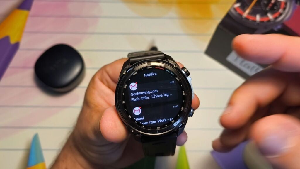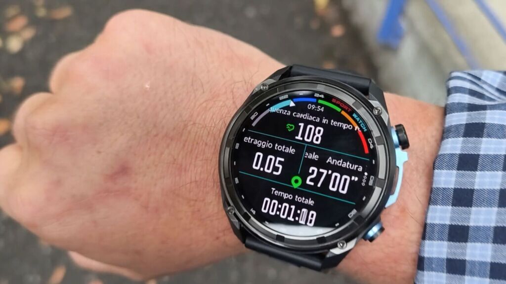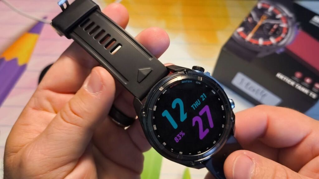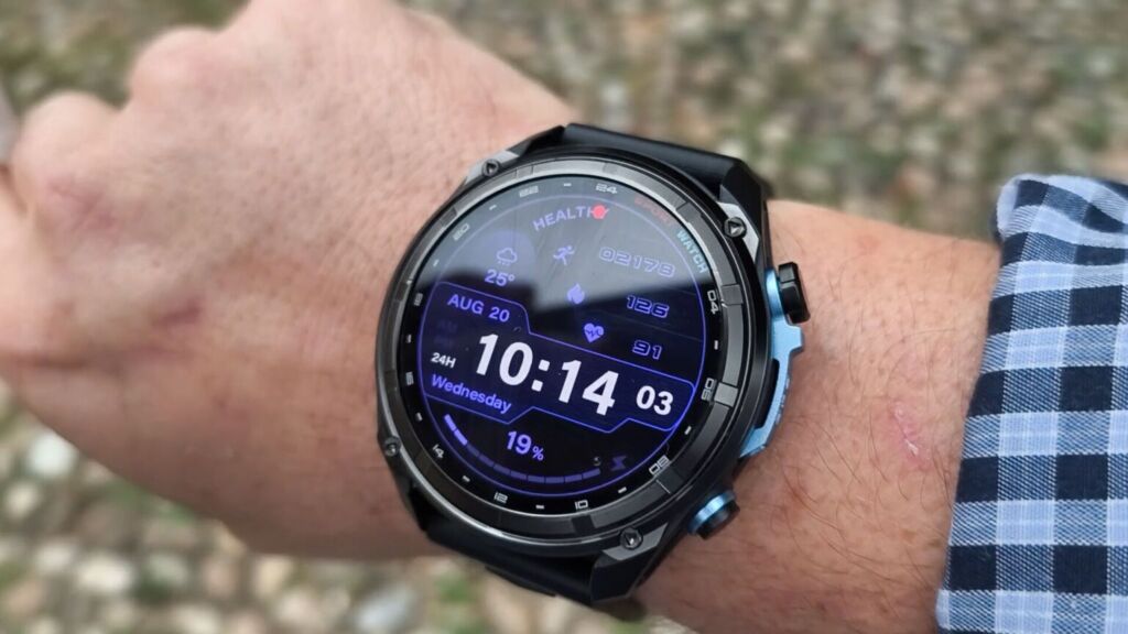 Apropos Display: Ein ansprechendes und recht großes 1,43-Zoll-AMOLED-Panel nimmt den größten Teil der Oberfläche ein. Die Tank T5 verfügt über eine Lünette mit umlaufenden 2er-Anzeigen. Das Zifferblatt ist sportlich gestaltet und dank der Auflösung von 461 ppi und der Spitzenhelligkeit von 1000 Nits ist es scharf und klar ablesbar. Leider gibt es keinen automatischen Helligkeitssensor. Ich fand die Farben außerdem lebendig und bei direkter Sonneneinstrahlung besser erkennbar. Insgesamt ist das Display für eine Smartwatch gut, aber noch besser, wenn man bedenkt, dass sie für unter 60 Dollar zu haben ist.