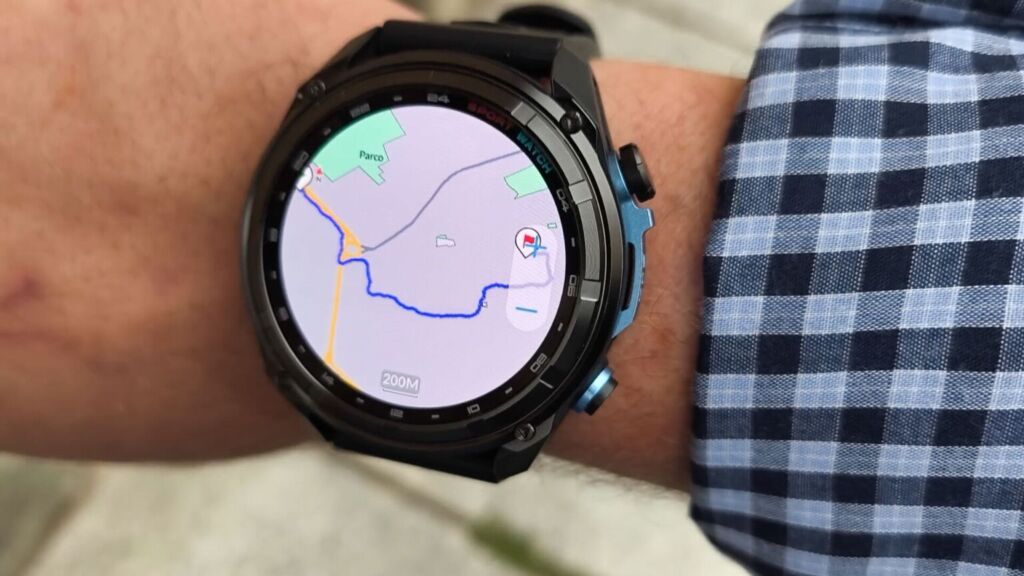 Eine der Hauptstärken dieser Smartwatch ist ihr umfassendes Angebot für Naturerlebnisse. Sie besticht durch ihre markante Optik und Abmessungen, die an eine Casio G-SHOCK erinnern. Im Mittelpunkt der Marketingkampagne der Tank T5 steht die Offline-Kartenfunktion als zentrales Feature, weshalb sich ein Kauf lohnt. Ich persönlich nutze diese Funktion zwar nicht, schätze aber die Möglichkeit, die Wanderroute zu tracken. Diese Funktion erfordert einige Einrichtungsschritte, da die App auf Webseiten verweist, von denen Dateien auf einen Computer heruntergeladen und auf die Uhr übertragen werden müssen. Die Uhr verfügt jedoch auch über ein Standard-GPS mit exzellenter Genauigkeit und schnellen Satellitenortungen.