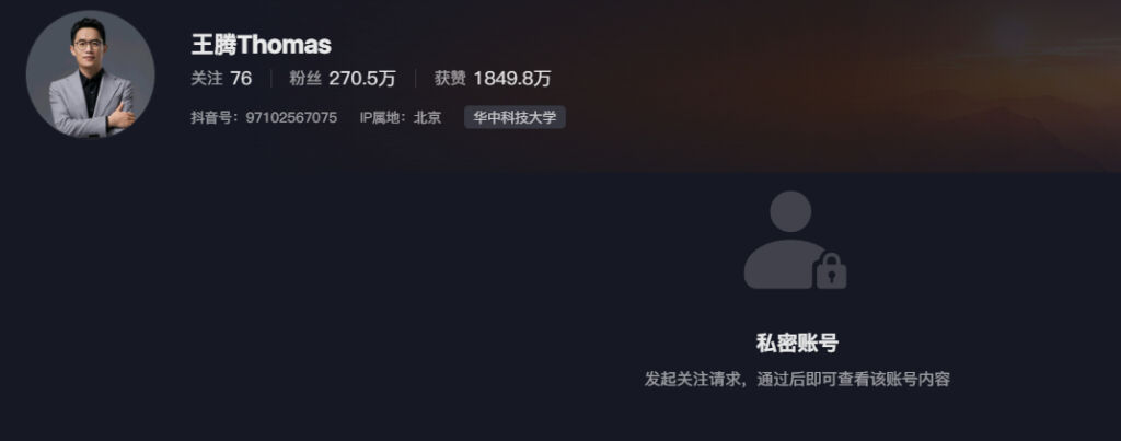 Wang Teng bestätigte den Vorfall persönlich und veröffentlichte eine Erklärung, in der er zugab, Fehler gemacht zu haben und bereit zu sein, die Konsequenzen zu tragen. Sein persönlicher Douyin-Account, auf dem er normalerweise Videos und Live-Streams teilte, wurde auf privat gestellt, sodass Inhalte nur nach vorheriger Genehmigung sichtbar sind. Der Account hat derzeit 2,705 Millionen Follower.