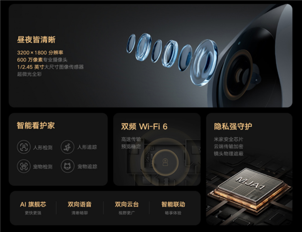 Das Design ermöglicht eine horizontale Drehung um 360° und eine vertikale Drehung um bis zu 116°, wodurch tote Winkel vermieden werden. Es unterstützt microSD-Karten mit bis zu 256 GB, unterstützt NAS-Speicher und lässt sich nahtlos in das Xiaomi-Ökosystem integrieren. Ein Beispiel: Es kann die Klimaanlagentemperatur automatisch an die Anzahl der im Raum erkannten Personen anpassen.